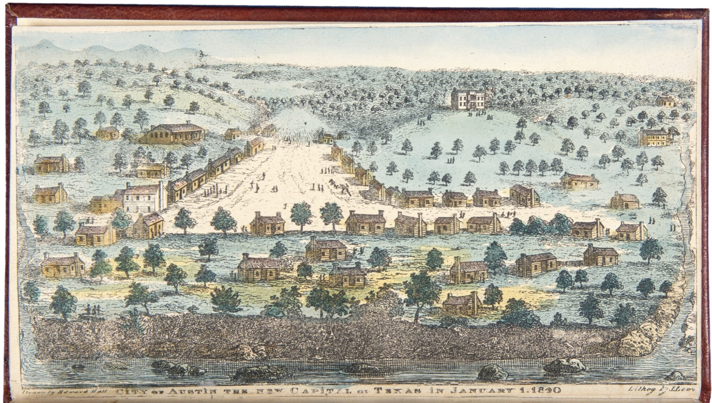The new capital would front the Colorado River. A broad avenue, a central spine, would proceed northwards from the east-west running Water Avenue, aptly named as it overlooked the river. As the seat of empire envisioned by Lamar, the avenue leading to the Capitol Square was dubbed Congress Avenue. The 14-block grid plan paid homage to Texas geography. On either side, the north-south streets would be named for the rivers of Texas, beginning with Rio Grande on the western side of the plat and ending with the Sabine on the east, just as the rivers run in Texas— later, they would be numbered. The cross streets moving east and west would be named for the trees of Texas. Today, only 6th Street, also known as Pecan Street, retains the memory of these trees. If you want to see the original names, consult Waller’s plan online and enlarge the elegantly drawn image. The city is bounded by West Avenue, East Avenue, North Avenue, and Water Avenue. Shoal Creek runs through the southwest corner, and Waller Creek meanders along the entire east side. The northernmost street, above the Capitol block, was named North Avenue.
